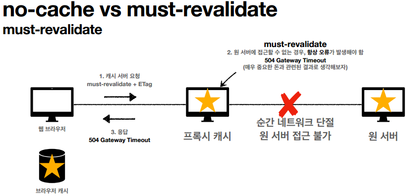 must-revalidate에서 프록시 캐시 -> 원 서버에서 순간 네트워크 단절이 되어 원 서버에 접근이 불가할 경우