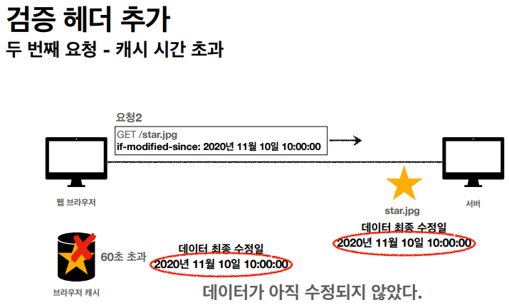 캐시 사용 기한이 지나서 서버로 새로 요청을 보낼 때 if-modified-since라는 헤더를 붙여 보낸다.