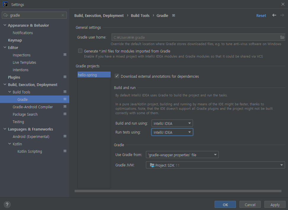 오류 해결 Process 'command 'C:/Program Files/Java/jdk-11.0.17/bin/java.exe'' finished with non-zero exit value 1 오류 해결 by 반오십 코린이 2023. 1. 3. 728x90 File -> Settings -> Build, Execution, Deployment -> Build Tools -> Gradle Build and run using과 Run tests using을 Intellij IDEA로 변경한다. 728x90 공유하기 게시글 관리 반오십 코딩일지 '오류 해결' 카테고리의 다른 글 스프링부트와 aws로 혼자 구현하는 웹서비스 - 로그인 문제 (1) 2023.09.08 [오류 해결] Method springSecurityFilterChain in org.springframework.security.config.annotation.web.configuration.WebSecurityConfiguration required a bean of type 'org.springframework.security.oauth2.client.registration.ClientRegistrationRepository' .. (0) 2023.09.06 Uncaught ReferenceError: JSon is not defined 오류 해결 (0) 2023.09.05 Web server failed to start. Port 8080 was already in use 에러 (0) 2023.01.03 관련글 스프링부트와 aws로 혼자 구현하는 웹서비스 - 로그인 문제 [오류 해결] Method springSecurityFilterChain in org.springframework.security.config.annotation.web.configuration.WebSecurityConfiguration required a bean of type 'org.springframework.security.oauth2.client.registration.ClientRegistrationRepository' .. Uncaught ReferenceError: JSon is not defined 오류 해결 Web server failed to start. Port 8080 was already in use 에러